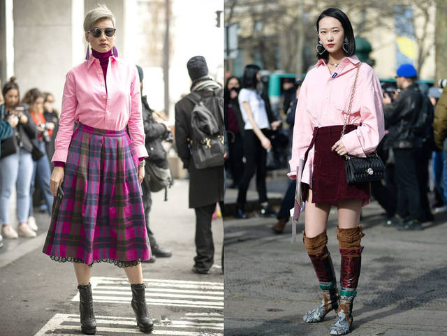 粉色衬衫搭配格纹半裙,甜美减龄的同时多了几分复古摩登风,粉色配玫粉色,搭配很大胆。粉色衬衫配丝绒面料的半裙也很不错,丝绒复古温暖,加上开叉设计,让粉色衬衫在正经中多一种个性不羁范。
