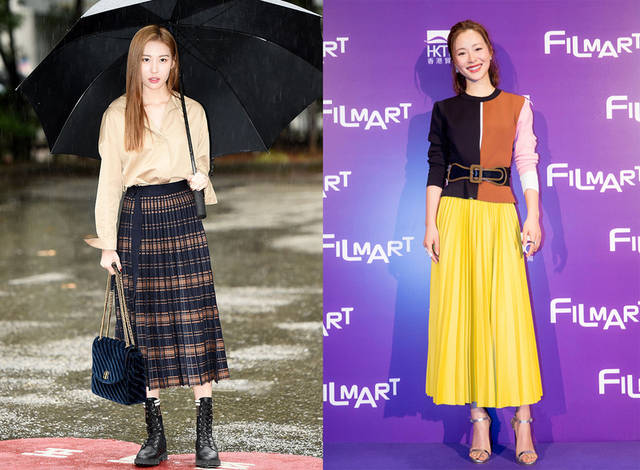 宣美这件格纹款的百褶裙浪漫灵动中多了一股复古摩登风,上身选择一件肤色丝质衬衫,整个人的气质瞬间提升了好几番。江一燕选择了黄色百褶半裙,黄色系活泼吸睛,上身一件拼色款毛衣,优雅与少女兼具。