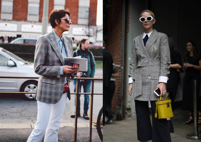 ♦简单的格纹款西装,在选择灰色调时,整体简单色调组合是深灰格纹西装搭配灰色针织连衣裙,彩色的包包和鞋子穿搭。白色的西装日常选搭黑色裤装偏多,想要淡雅的造型,和白色裤装组合,包包和鞋子也选择白色。