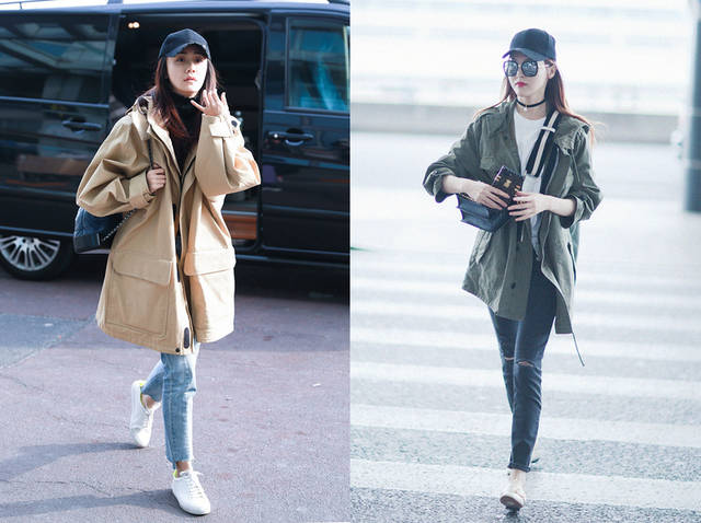 最近刘芸出现在机场就穿了一件卡其色的工装外套,卡其色的工装外套率性百搭,搭配基础的黑色打底衫和牛仔裤就非常时髦耐看。唐嫣选择的是军绿色的工装外套,搭配上白T恤和破洞牛仔裤,非常帅气年轻的一身穿搭。