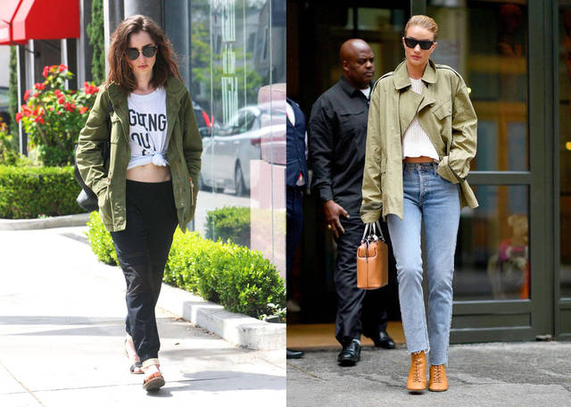 军绿色工装外套是工装外套中最为经典的色系,很多明星和达人都喜欢军绿色工装外套,军绿色搭配上利落的工装外套,显得女性更加英气不凡。现在这个微凉的时节,工装外套搭配上T恤衫或针织衫穿最合适不过了。