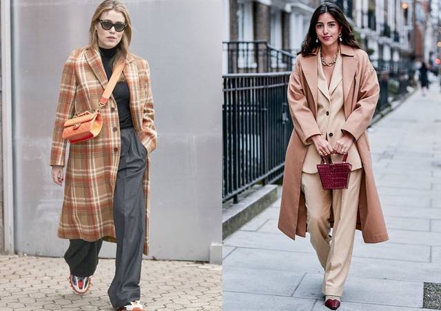 ♦日常穿搭中选择暖色调的搭配,那么黑色的裤装搭配黑色内搭,选择暖色格纹风衣就可以了,选择橘色的包包搭配。还要整体相近色调的搭配,在选择包包和鞋子的颜色时,日常出街选择黑色就可以了,上图中的红色是推荐搭配选择。