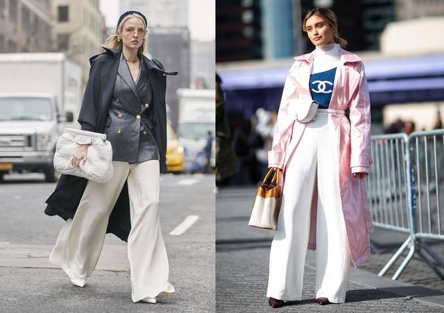 ♦简单的白色阔腿裤在选搭的时候,上图一中的黑色风衣和黑色内搭组合,简单的上下色调分明的穿搭组合,选择简约的白色包包就可以了。或者是选择淡粉色的风衣搭配,淡淡的甜美,淡淡的优雅穿搭,可以尝试选择白色的腰包装饰。