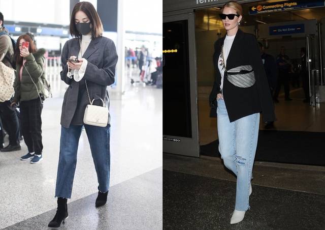♦在选择西装的时候,简单的款式,黑灰色是最经常选择的,上图一中:深灰西装+白色内搭+牛仔直筒裤+白色包包+黑色短靴,白色的短靴也是推荐选择,还有就是选择包包的时候,除了简单的挎包,还有腰包也是推荐搭配。