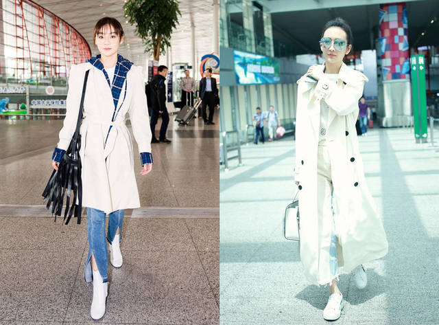 首先是白色款,今年很多明星都很钟爱白色款风衣,白色让通勤的风衣更加多了几分清新高级范。袁姗姗最近就穿了一身白色风衣和牛仔裤的造型,白蓝搭配通勤又很清爽。王鸥选择了白T恤和白裤子搭配白风衣,整体穿搭更是清爽无比。