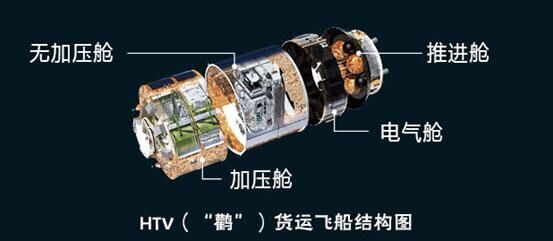 HTV舱段分为四个部分:加压舱、无加压舱、电气舱,推进舱。加压舱主要放置食物、水等生活补给品和大型实验设备,位于与空间站的对接处,国际空间站的宇航员可以不穿宇航服直接进入加压舱内搬运物资。无加压舱是放置空间站外部机械与实验平台仪器的区域,使用空间站的加拿大机械臂吊出放置。
