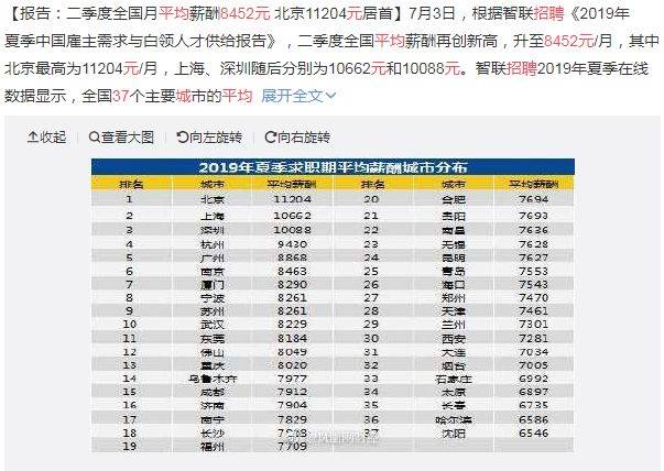 2019年7月3日,从北京发布的一份报告显示,全国37个主要城市的平均招聘薪酬为8452元/月。从城市来看,北京、上海、深圳的平均招聘月薪排名居前三。