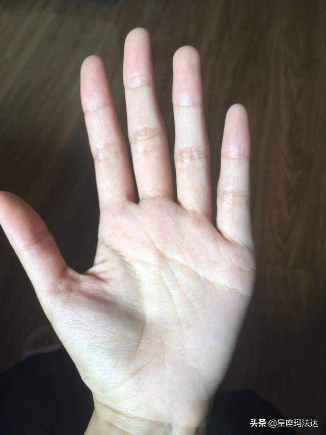 手相分析:从日主整个手型来看,为长方形的掌形,掌形较好,五指细长没有缺失。