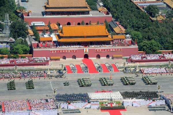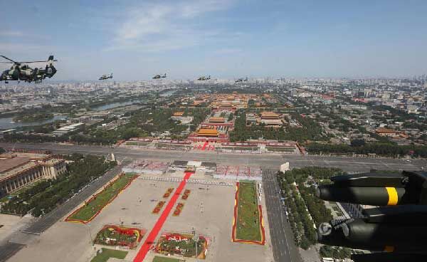 9月3日,中国人民抗日战争暨世界反法西斯战争胜利70周年纪念大会在北京隆重举行。图为航拍天安门广场阅兵图。