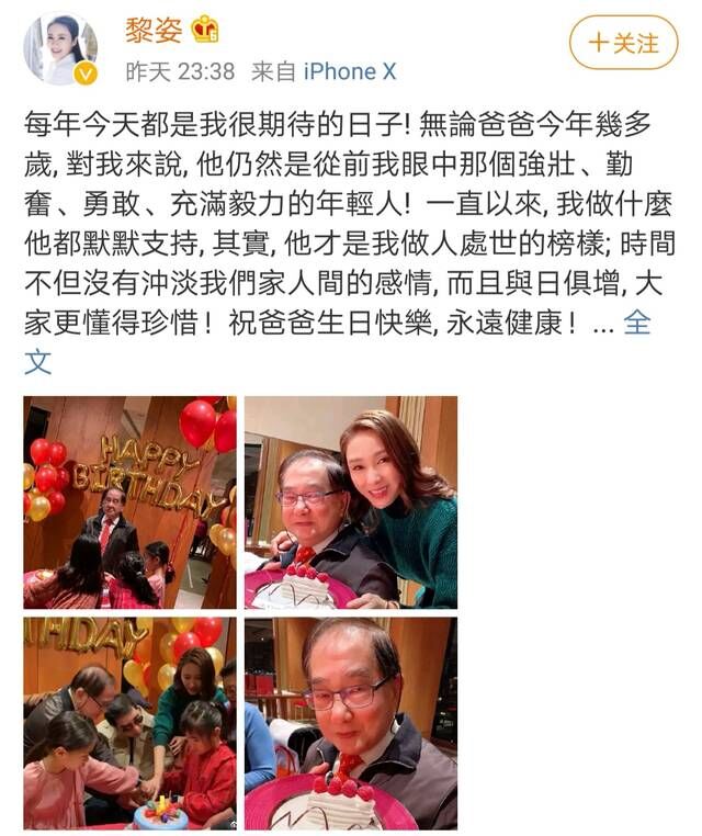 近日,黎姿在某社交平台上晒出了一组为父亲庆生的照片,黎姿的父亲黎柱如今已经82岁的高龄了,然而黎姿称父亲在她眼中仍旧是个强壮、勤奋、勇敢、充满毅力的年轻人,并配上与父亲的贴脸合照。另外,黎姿的三个女儿也出席了庆生宴会,一同为外公贺寿庆祝!