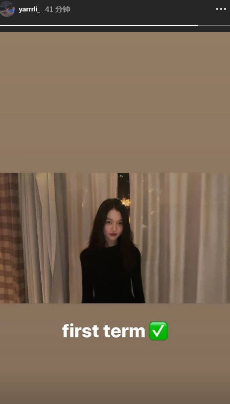 12月12日,李嫣在社交平台上分享了一张照片,并配文:first term,言语中除了满是放寒假了的兴奋感,还有几分终于解放了的感觉。照片中,李嫣身穿黑色针织衫,长卷发披肩,妆容精致,看上去很是成熟,气质高也变得高冷了许多。细心的网友还发现留学不到半年的李嫣竟然瘦了一大圈,不知道是不是学习生活太累了。