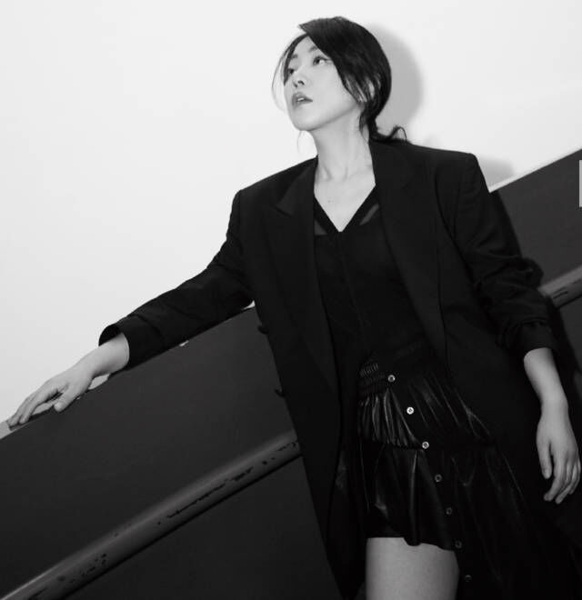 可以看到她穿着一件黑色的上衣,薄纱的设计给人的感觉还是很不错的,有类似裙子的设计感,让她显得特别的阳光。