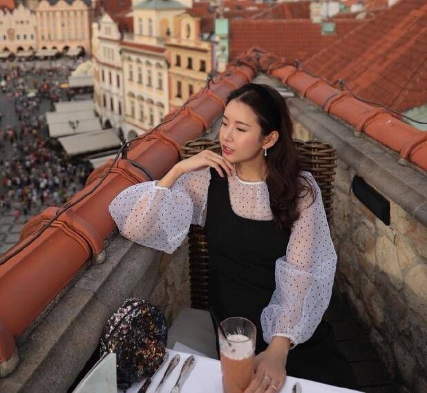 张子萱穿着一件波点的白色上衣,给人的感觉还是很阳光的。宽松的袖子设计,让她显得特别洋气,无论是从哪方面来看,让她显得都比较的舒服。而且还是透视的设计,让她更有女人味和少女感。