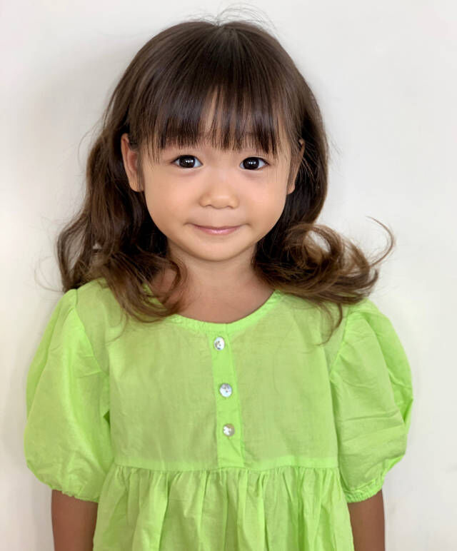 水汪汪的大眼睛特别的有灵气,一头波浪的长发,也显得很有魅力,额前还梳着齐刘海,让她显得更加的阳光,整体给人的感觉还是很舒服的,在气色上也显得更加的可爱。