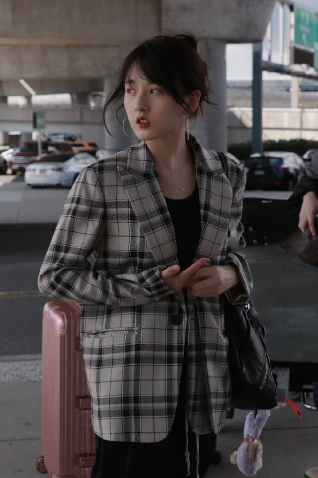 照片的宋祖儿身穿咖啡色格纹西装,款式是比较常规的,没有过多的修饰,除了咖啡色与黑色的拼接撞色让西装显得不同。宋祖儿外套里内搭了一件黑色露脐背心,脖子上带着小吊坠,给西装与黑色的沉闷中增加了一点柔色,很有女人味。宋祖儿的下半身穿着黑色运动裤,裤腿紧实的包裹着小腿,腿部线条立刻展现出来,脚上还搭了一双小白鞋,整体给人的感觉又A又飒还有点小女人的味道。