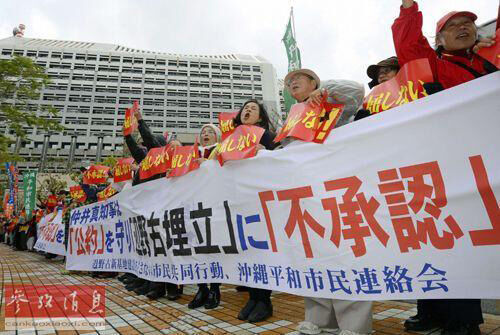 资料图:日本民众在位于那霸的冲绳县政府大楼前抗议美军基地搬迁计划