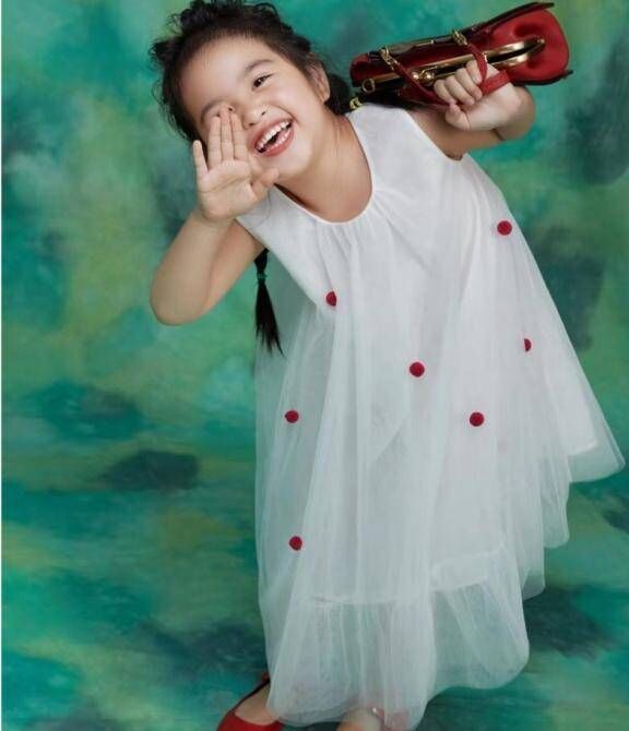 饺子穿着一件白色的连衣裙,上面点缀着几枚红色的波点,看上去很洋气。而且这白色纱裙做出的纺纱设计,让她自身也显得特别的可爱。