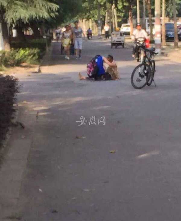 目击者说,当时她和室友去淮南师范学院吃饭,与和小袁对向而行。事情发生之前,她看到老人走路不稳,一崴一崴的。后来,小袁骑车从老太身边经过,但不知道什么原因,老太就倒地了。当时小袁骑车已经过去了,老太又喊住小袁,小袁把车子停下,将老太扶着坐了起来。她当时犹豫是不是过去,后来还是过去了,和小袁一起帮老人揉腿。