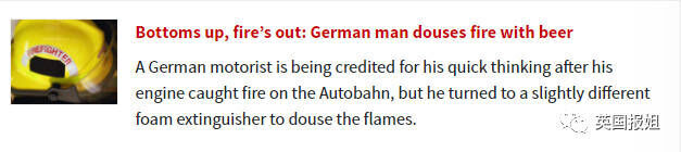 2.巴伐利亚高速一汽车发动机突然着火,男子猛浇一桶啤酒将其扑灭。 媒体:不愧是你,德国人。