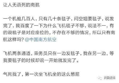 而从她的叙述可以得知,让西西生气的原因则是乘务员只在一边发毯子,当她想要毯子的时候,却被告知一开始就发完了。