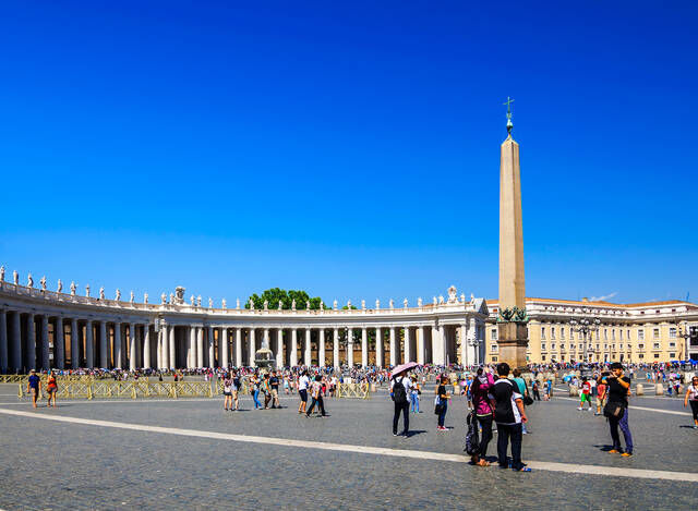 圣彼得广场,被称为世界上最对称、最壮丽的广场。圣彼得广场同圣彼得大教堂是一组不可分割的建筑艺术整体,是举行盛大宗教活动的地方,可容纳50万人。广场长340米,宽240米,两侧由88根方柱和288根圆柱,组成的半椭圆形环绕柱廊。柱高达18米,分排四列,形成三条走廊,宛如4人一列的队伍排列在广场两边。