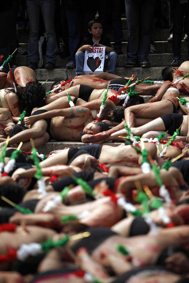 动物保护者身涂红漆抗议斗牛运动