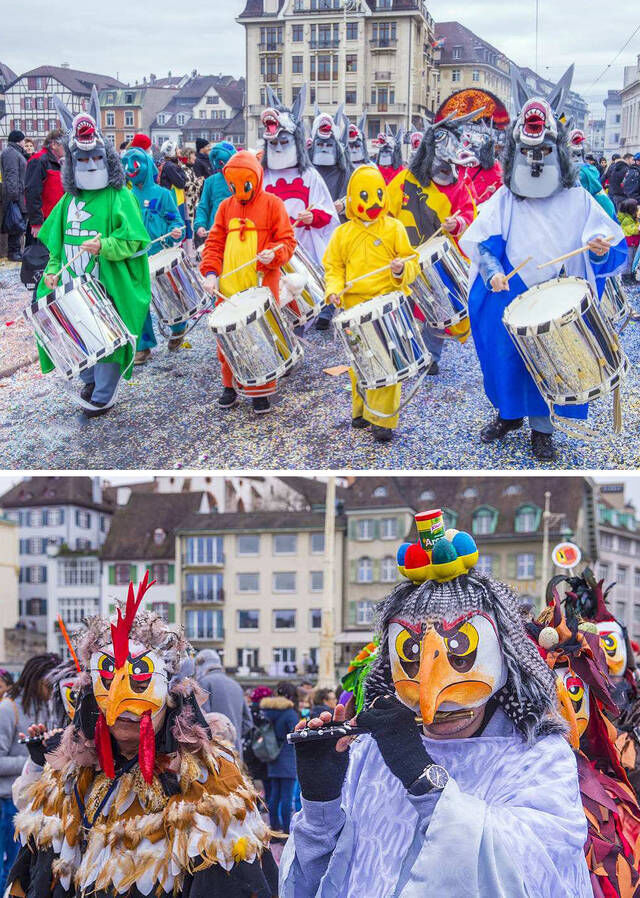 狂欢节期间,是瑞士人一年四季中最无与伦比、最热闹非凡的豪华节日:夸张诡异的面具、五颜六色的花车、华丽奇特的服饰造型、玩偶糖果、鲜花美酒、彩旗飘扬、纸屑飞舞,和高亮清脆的笛声,震耳欲聋的鼓声一起,为人们呈现了一场精彩绝伦的视觉与听觉的狂欢盛宴……
