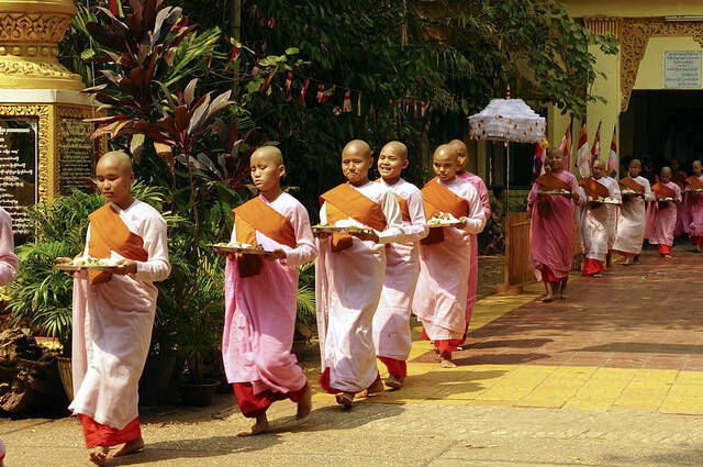 缅甸是个佛教国家,佛教传入缅甸已有2500多年的历史,几乎是全民信佛。和尚在缅甸拥有相当高的低位。男人只有出家当一次和尚,社会上才承认其成人,还俗以后才能够享有结婚的权力。因此,男人出家当和尚是很普遍的现象,但是女人没有要求必须出家当尼姑,而且也不被承认。即便如此,缅甸还是有许多尼姑。为什么?据当地一位长者称,可能是她们自己觉得出家为尼,显得对佛的虔诚。