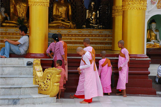 走在缅甸大街小巷,你会发现满眼都是和尚、尼姑。有意思的是,僧侣着装色彩是紫红色,尼姑的着装是粉红色,小沙弥则是纯白色,在热带的金色佛寺背景下分外耀眼,成为一道亮丽的风景线。