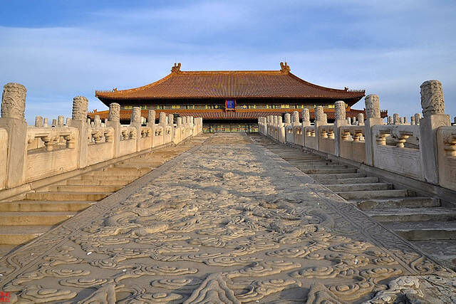 故宫分为“外朝”与“内廷”两大部分。“外朝”与“内廷”以乾清门为界,乾清门以南为外朝,以北为内廷。外朝以太和殿、中和殿、保和殿三大殿为中心,是皇帝举行朝会和盛典的地方,也称为“前朝”。此外两翼东有文华殿、文渊阁、上驷院、南三所;西有武英殿、内务府等建筑。