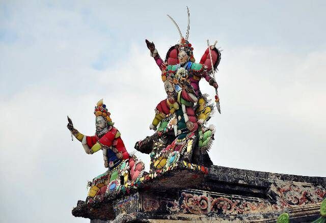 潮汕传统建筑,无论是府第式民居,还是家族祠堂、宗教寺庙,大都气派豪华,雕梁画栋,富丽堂皇。从远处看,这些建筑首先映入眼帘的就是屋顶上那亮丽的嵌瓷装饰。