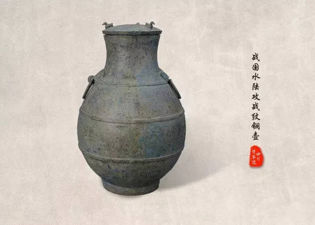 我来自四川省博物馆,我叫水陆攻战纹铜壶,口径13.2厘米,高40.3厘米,是战国时期的一种酒器。