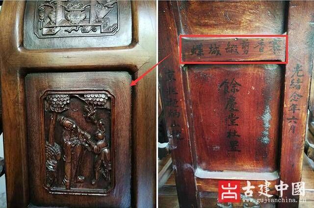 四把椅子每一个图案和文字都有自己的故事和意境。首先四把太师椅背面有相同的文字,左边为“京兆郡炳山號”,中间“馀庆堂杜置”,右边为“光绪念年六月”。可以考证出,这四把清代三屏式官帽太师椅为1894年6月由京兆郡炳山號馀庆堂的一家杜姓人家所置办。