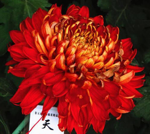 此菊花是非常宝贵的一种,名为“帅旗”,同样仍是我国五台甫菊之首的帅旗菊花,而且有着很高的位置,能看出来它的花朵是很大的,色彩鲜艳有光泽,它的花型也是比较多变的,叶子也是相对肥壮,浓郁而又有光泽,咱们能看到帅旗花正面是紫赤色,背面是金黄色的,中心是筒状花黄绿色的,整体花型看上去真是美艳极了。