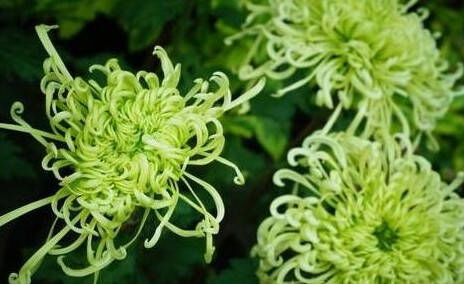 绿窗纱影的花外圈是白色的、内圈又是翠绿色。细管型的花瓣外圈飞舞着长瓣、瓣端有匙环状。开花时如同细雨含纱一样,翠绿心爱。绿窗纱影在一百多年前,中日两国互赠了100种菊花名品。作为中日友爱的“送花使者”,“绿窗纱影”来到我国,经过几代我国闻名菊花专家的精心栽培的珍稀名菊。