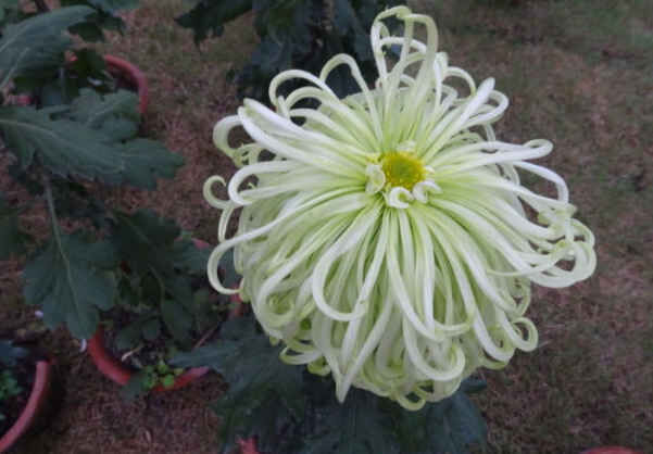 绿蝴蝶,花样翠绿,长的的管匙瓣下垂潇洒,瓣端呈倒钩。远看像只绿蝴蝶在菊叶上翩翩起舞!