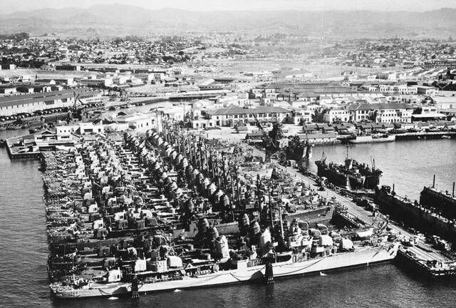 1941年12月8日,日本偷袭珍珠港的第二天,美国正式对日本宣战,加入第二次世界大战。然后美国就展开了令人咋舌的工业制造能力,数以千计的各种先进战舰进入船坞进行建造,并在很短的时间内建成下水,加入对日本作战的行列。