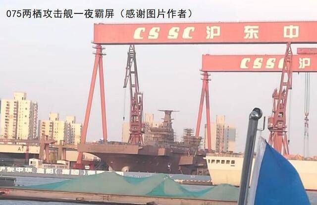 根据网络上发布的照片判断,正在沪东中华造船厂建造的075型两栖攻击舰,采用了直通甲板,未来将搭载舰载直升机等武器。按照图片中的进度,预计明年的时候,这艘两栖攻击舰将建成下水,随后即将展开相关的海试工作。