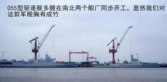 自2014年首舰开工建造以来,055型驱逐舰的建造工作进入了一个快车道,由南北两大造船厂同时开工,多艘军舰同时在船坞建造,速度和进度相当快。这一方面说明中国对这种类型的军舰需求的迫切程度,另外一方面也说明中国对这款军舰未来的战斗力可以说胸有成竹。