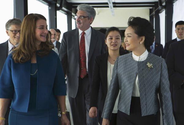 彭丽媛抵达时,受到研究中心主任吉利兰、盖茨基金会联席主席比尔·盖茨夫妇、美国驻华大使博卡斯夫人韩斯的热情欢迎。图为比尔·盖茨和夫人梅琳达·盖茨迎接彭丽媛。