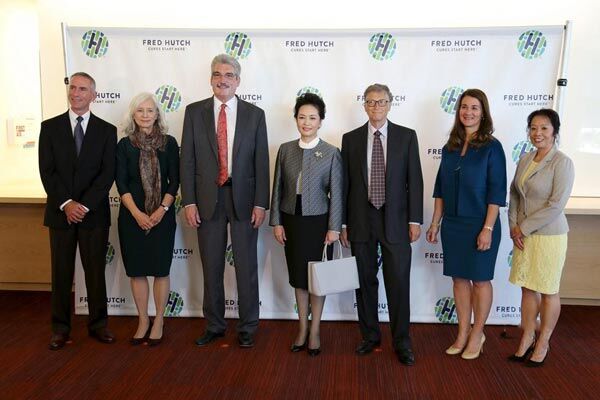 福瑞德·哈金森研究中心于1975年正式挂牌,是世界领先的癌症研究机构之一,拥有3位诺贝尔奖得主。盖茨基金会捐赠是研究中心资金主要来源之一。图为彭丽媛与比尔·盖茨夫妇以及研究中心负责人合影。