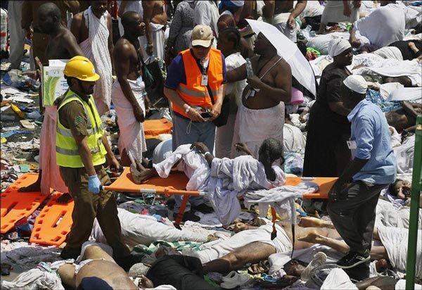 这次的踩踏事故发生在朝圣者准备举行投石仪式的时候,一些人没有按照官方要求行事导致人群开始分外拥挤,随后便发生踩踏,现场不时听到阵阵哭喊声。图为现场医护人员进行救助。