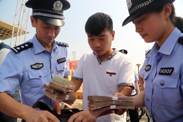 2015年9月26日,河南省安阳市“两馆”南侧广场,在市公安局举行的被盗抢骗财物集中认领大会上,来自汤阴县菜园镇的小张在民警的帮助下,把大学毕业一心找工作的姐姐被骗走的16.8万元现金装入手提包内。