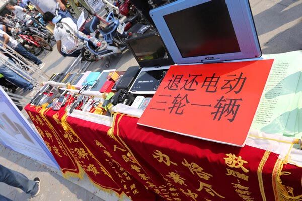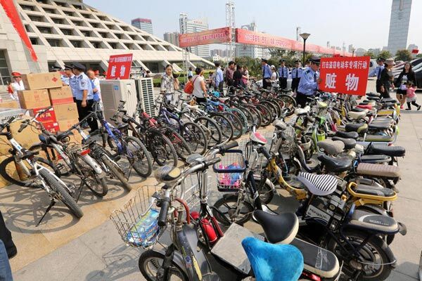 2015年9月26日,河南省安阳市“两馆”南侧广场,市公安局在此举行被盗抢骗财物集中认领大会,电动车、自行车、跑车、赛车与空调、名烟名酒认领区。