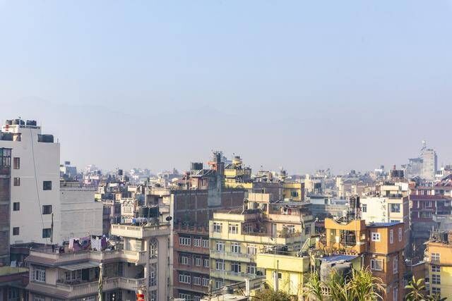 第二天清晨,爬上酒店的顶层阳台,这个七层楼的阳台就几乎已经能够眺望到整个加德满都的市区景观,空气状况比我想象中的差些,也是有不少的尘埃和雾霾,这个应该是和季节相关,雨季的时候会好很多。