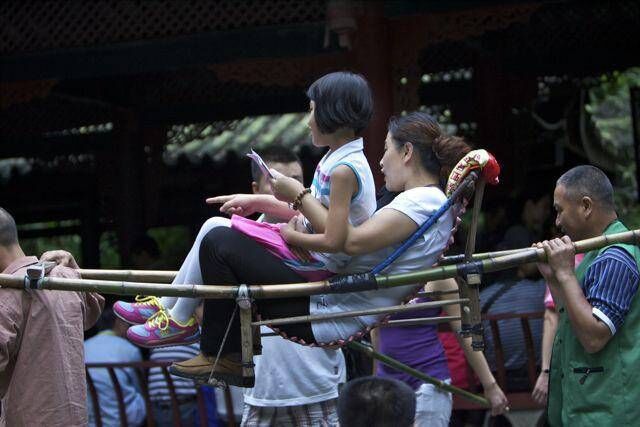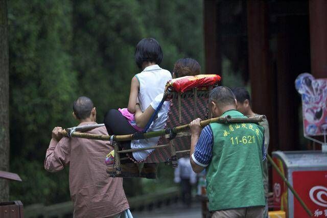 好比如峨眉山,峨眉山就有很多这样的挑夫。上下山的话,还是有一段距离的,所以他们每天就会抬着客人在山上来回跑!