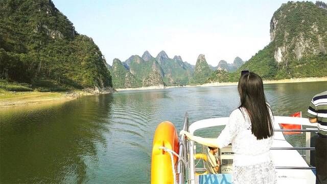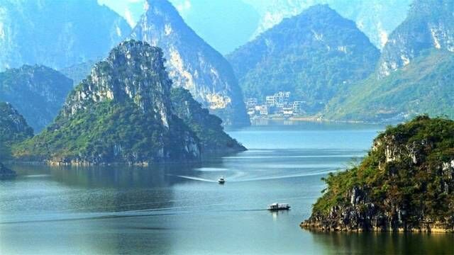 没错,这里就是著名的喀斯特地貌,喀斯湖水是广西的一大奇景,这里群山环绕,湖水清澈,是著名的旅游盛地。游玩在这里,你会感受纯真的自然风光,蜿蜒曲折的山峦下流淌着清澈的湖水,不远处划船的渔民哼着小歌,宛如一副静态的画卷。