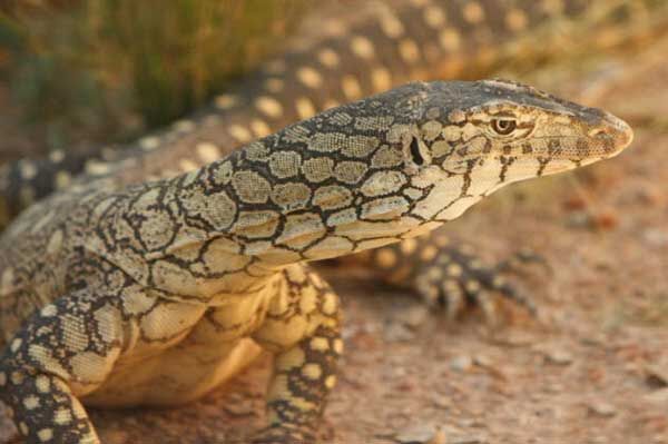 眼 斑巨蜥:眼斑巨蜥是澳大利亚境内体型最大的蜥蜴物种,体长可达到2.5米,这些蜥蜴爬行速度非常快,可达到每小时40公里。虽然奔跑时是4条腿快速移动, 但有时它们仅使用两条后腿快速奔跑,它们的体型和奔跑能力可以捕捉野兔、鸟类、小型有袋动物,甚至体型较大的毒蛇,但是它们并不处于顶层食物链。