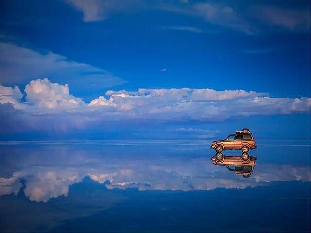 乌尤尼盐沼又名天空之境,地处玻利维亚。是世界上最大的盐沼覆盖地,每当雨后,乌尤尼就会呈现出一派奇幻的景观,整个湖面如一面无边无际干净明亮的镜子,不论是天空、白云还是行走在上面的车、人,都会被清晰的反射出来,仿佛本来就是两个世界,湖面之上一个,湖面之下是另一个一模一样倒立的世界。