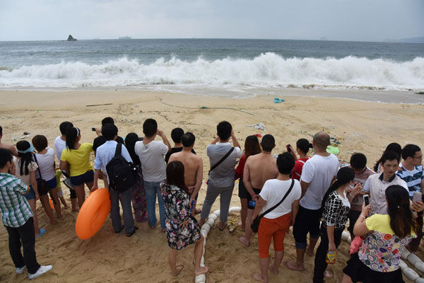 国庆黄金周第三日,受台风“彩虹”的影响,深圳大梅沙海滨浴场和海滨栈道因风浪太大而关闭,深圳市气象台于3日6时30分将台风白色预警升级为蓝色,但仍然挡不住游客涌向大海的热情,到中午12时,入园人数超过2万人,因不能下海,游客只能站在沙滩上的隔离线外看海。